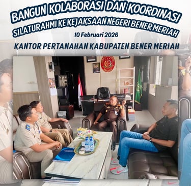 Kepala Kantor Pertanahan Kabupaten Bener Meriah, Bapak Lukman Nulhakim, S.Sit., M.Si., bersama Kepala Seksi Penetapan Hak dan Pendaftaran, Adil Tri Habda Harahap, S.P., melaksanakan kunjungan silaturahmi ke Kejaksaan Negeri Bener Meriah. Kunjungan ini merupakan bagian dari upaya mempererat hubungan kelembagaan dan memperkuat koordinasi antar instansi.