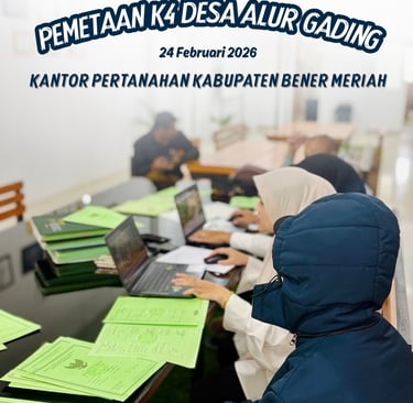Kegiatan pemetaan ini dilaksanakan di Aula Kantor Pertanahan Kabupaten Bener Meriah bersama Kepala Dusun serta aparat Desa Alur Gading sebagai bentuk sinergi dalam mendukung tertib administrasi pertanahan melalui pemutakhiran data bidang tanah.