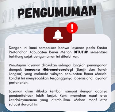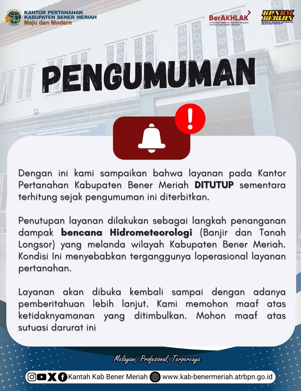 PENGUMUMAN PENUTUPAN PELAYANAN KANTOR PERTANAHAN KABUPATEN BENER MERIAH