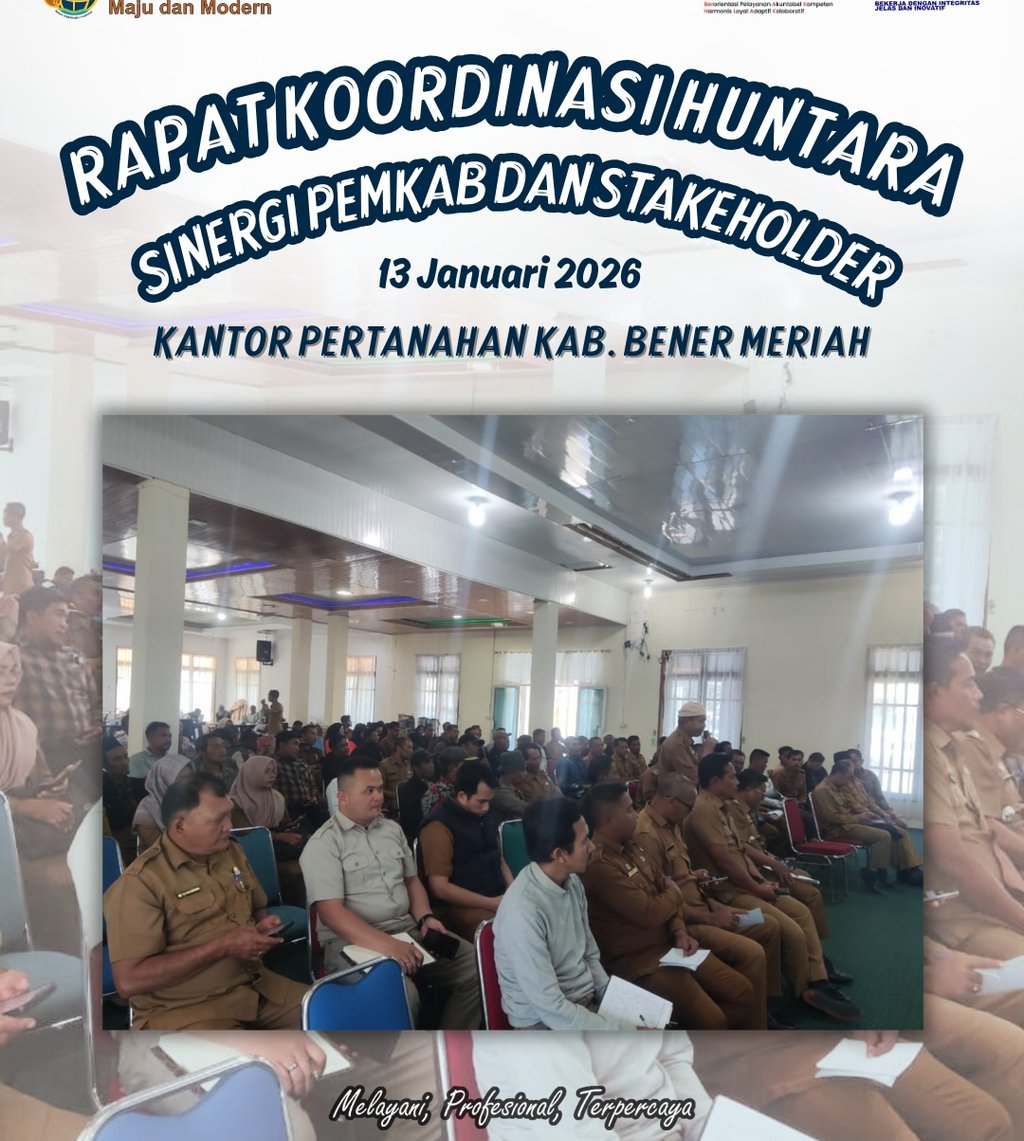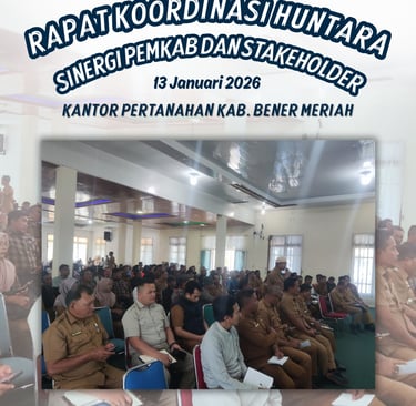Pada 12 Januari 2026, Kantor Pertanahan Kabupaten Bener Meriah menghadiri Rapat Koordinasi Rehab Rekon dan pendataan data valid terkait lokasi Hunian Sementara (Huntara) bagi korban bencana alam di Kabupaten Bener Meriah. Kegiatan ini dihadiri oleh Bupati dan Wakil Bupati Bener Meriah, dinas terkait, BNPB, seluruh camat wilayah terdampak, serta para reje kampung.