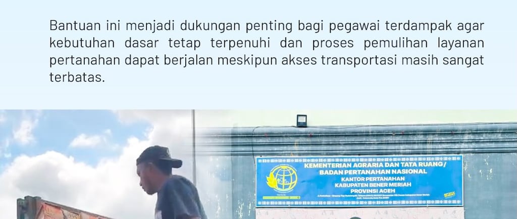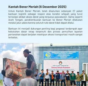 Kantor Pertanahan Kabupaten Bener Meriah menyampaikan ucapan terima kasih dan apresiasi yang setinggi-tingginya kepada Kantor Wilayah Badan Pertanahan Nasional Provinsi Aceh, khususnya kepada Bapak Kakanwil BPN Aceh, Dr. Arinaldi, S.SiT., S.H., M.M., atas perhatian dan bantuan yang telah diberikan kepada jajaran Kantah Bener Meriah pascabencana banjir yang mengakibatkan terputusnya akses darat di wilayah tersebut. Bantuan logistik yang disalurkan menjadi bentuk kepedulian nyata dalam situasi darurat yang dihadapi pegawai dan keluarga.